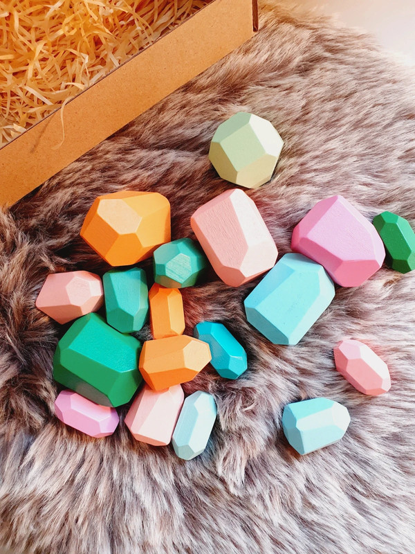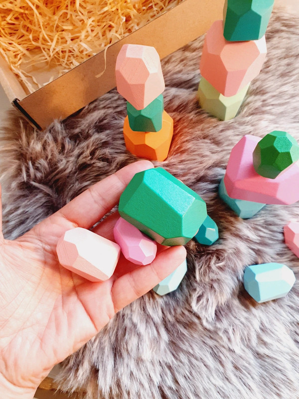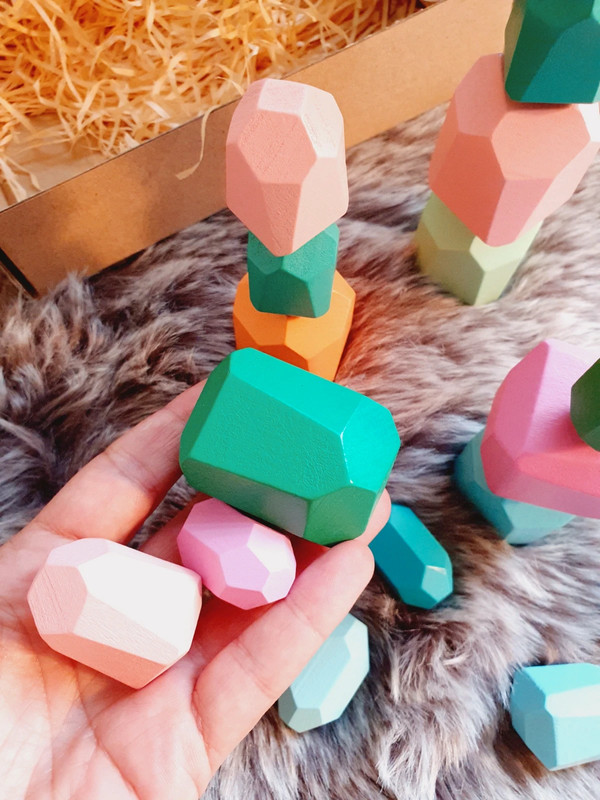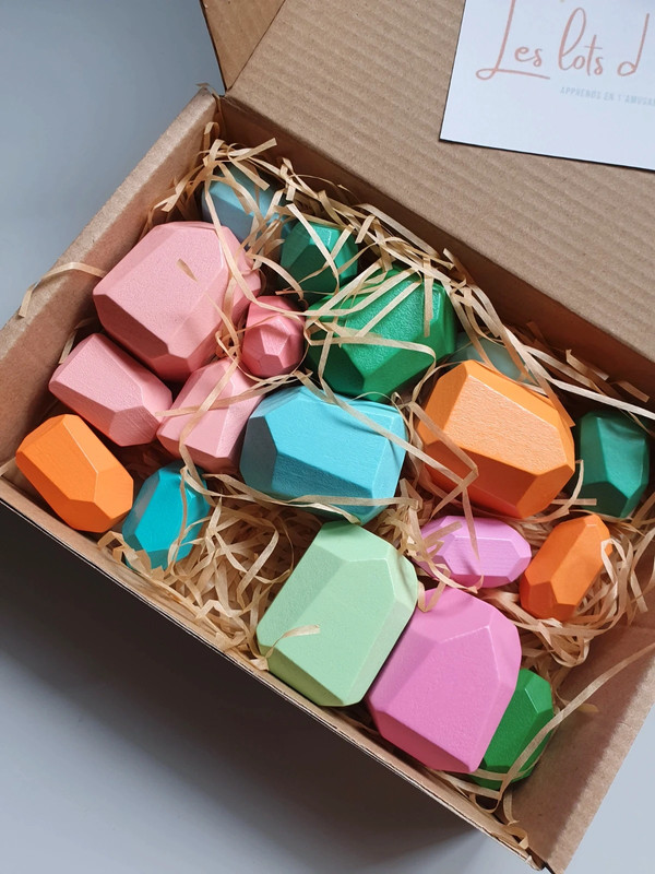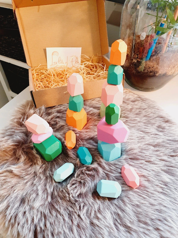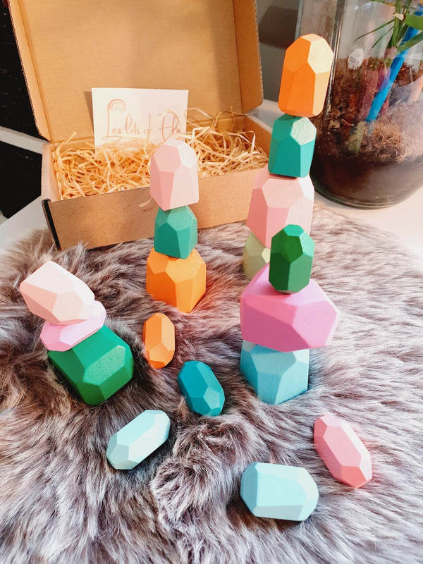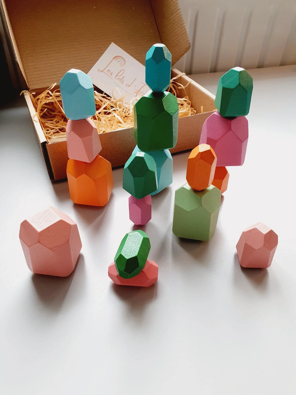 ✔️ 18 blocs en bois, tous uniques par leur forme et leur couleur