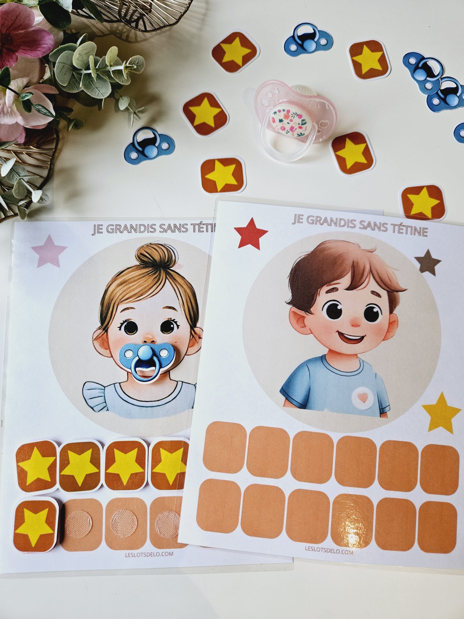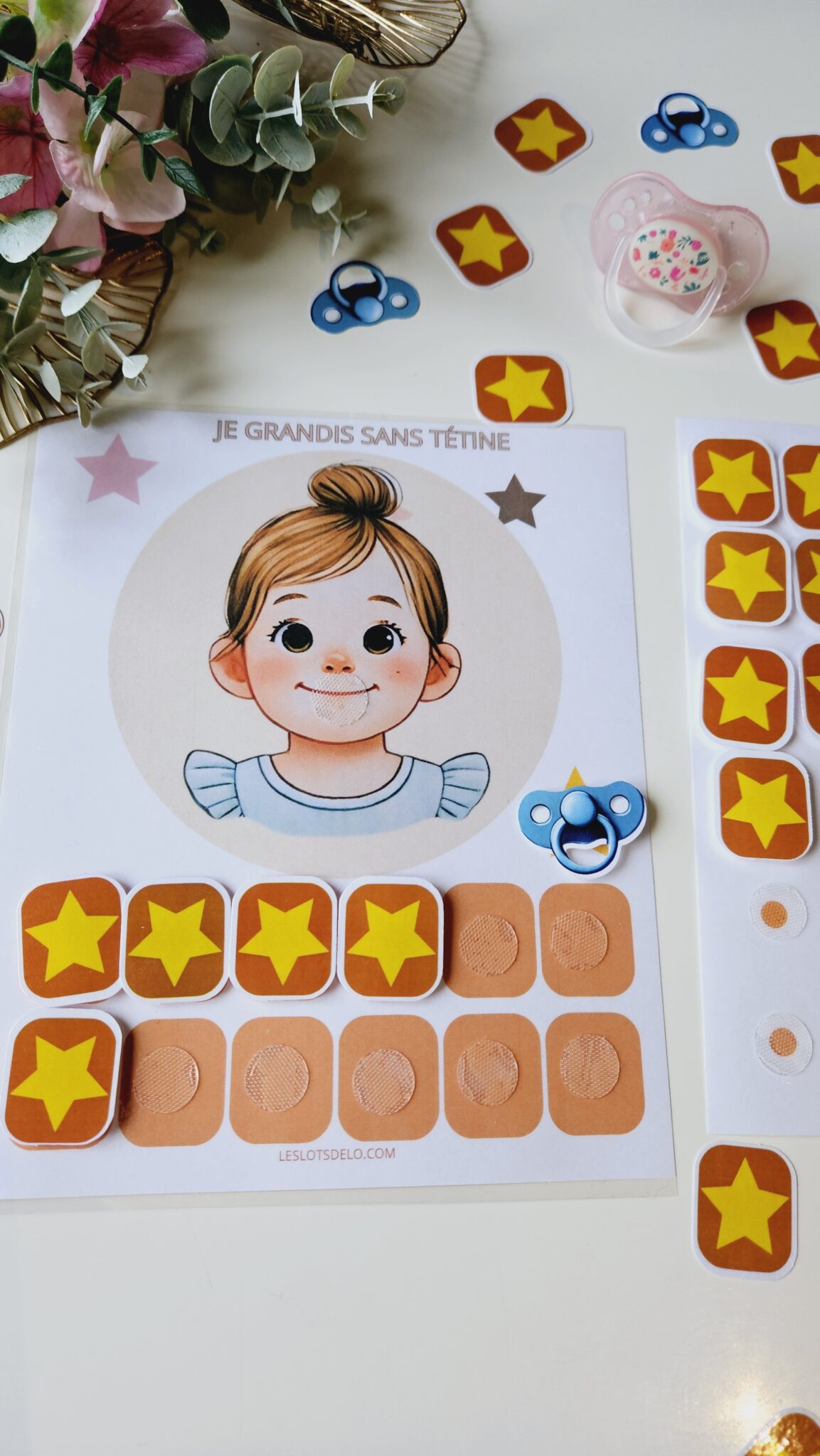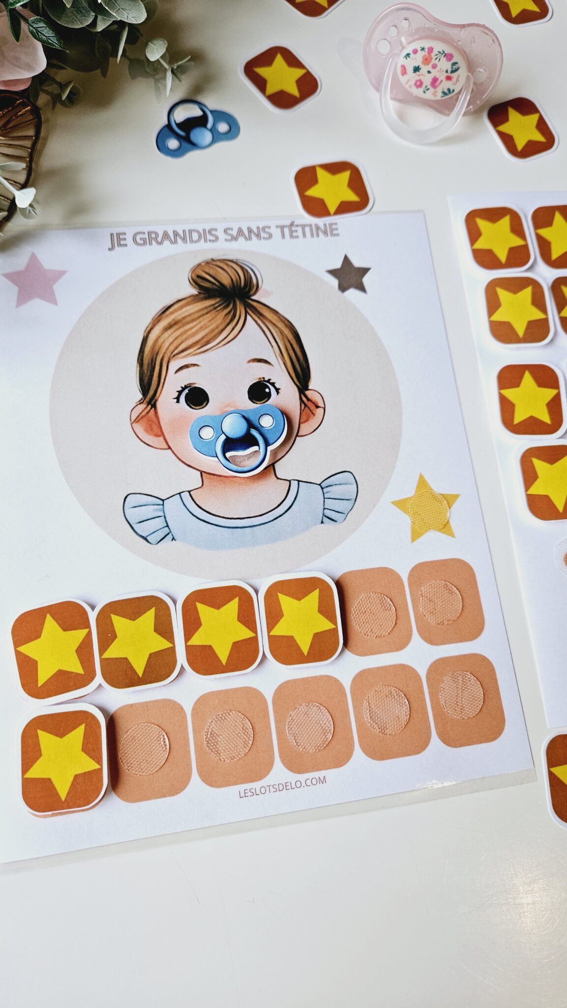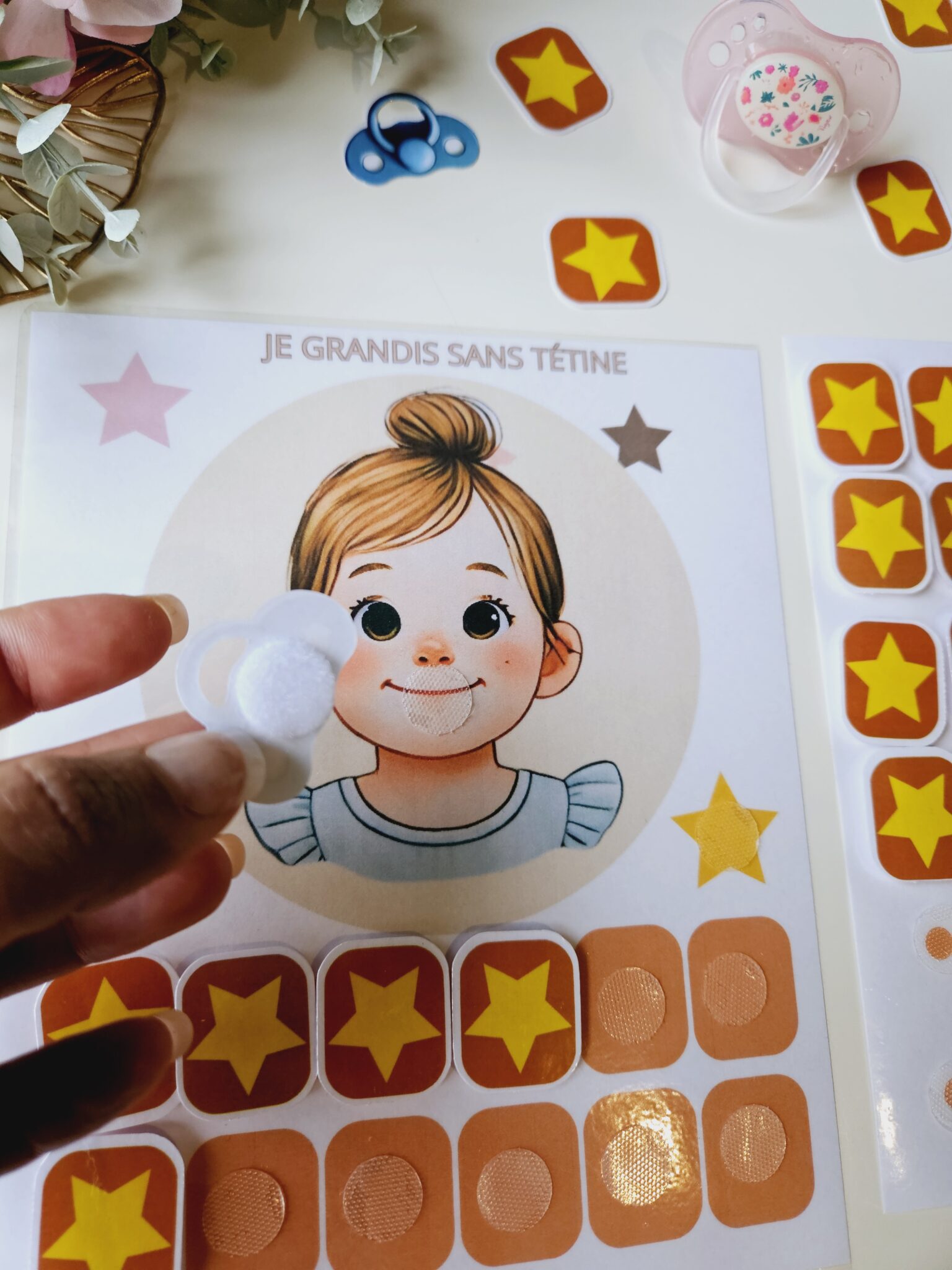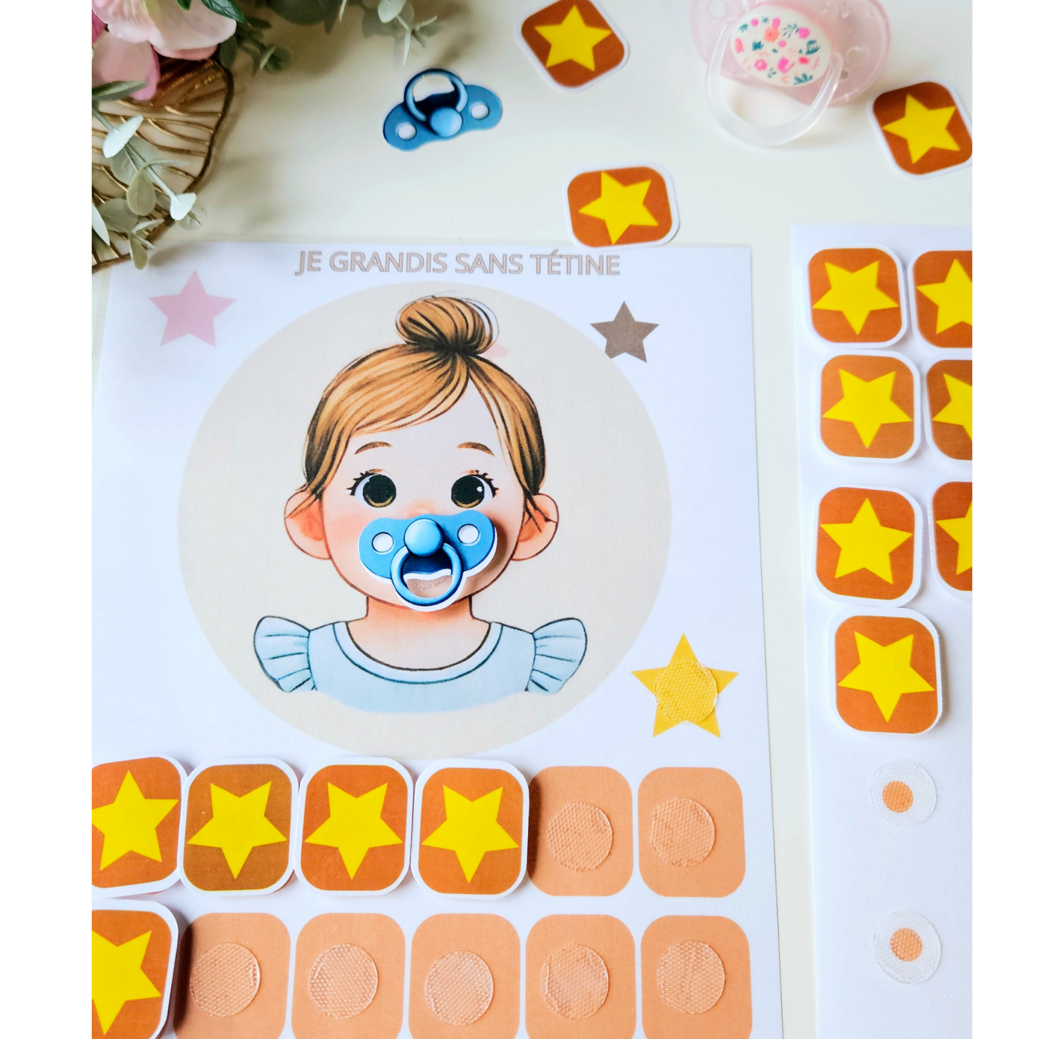 Ce support aide votre enfant à espacer l’usage de la tétine grâce à un système de scratch motivant. En imitant le petit personnage, l’enfant retire la tétine et la place sur l’étoile jaune. Chaque effort est valorisé par l’ajout d’une étoile sur la frise de progression.