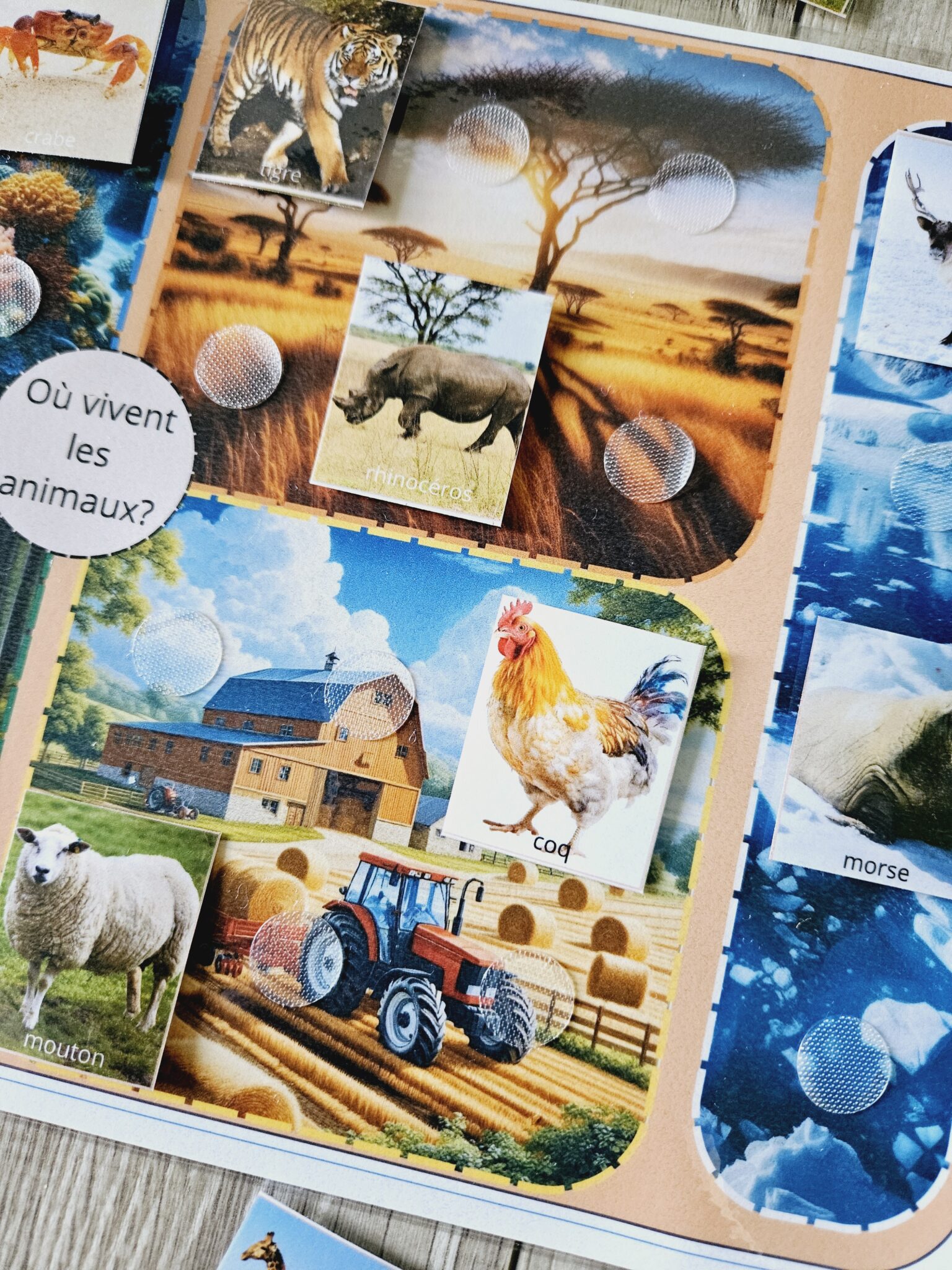 🔹28 Animaux à Associer : Chaque habitat accueille six animaux spécifiques. Par exemple, la vache, le mouton et le lapin trouveront leur place à la ferme, tandis que le crabe et le narval seront à positionner dans l’océan.