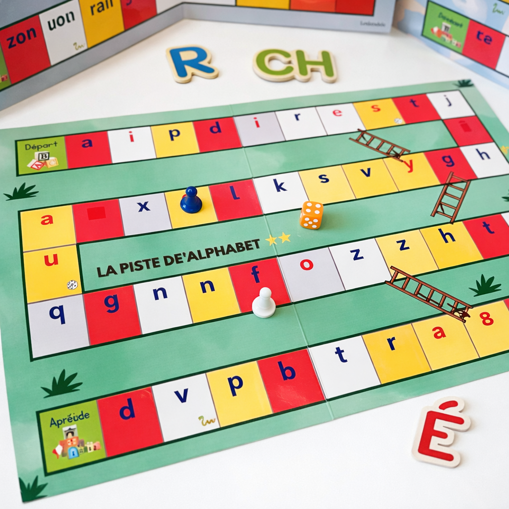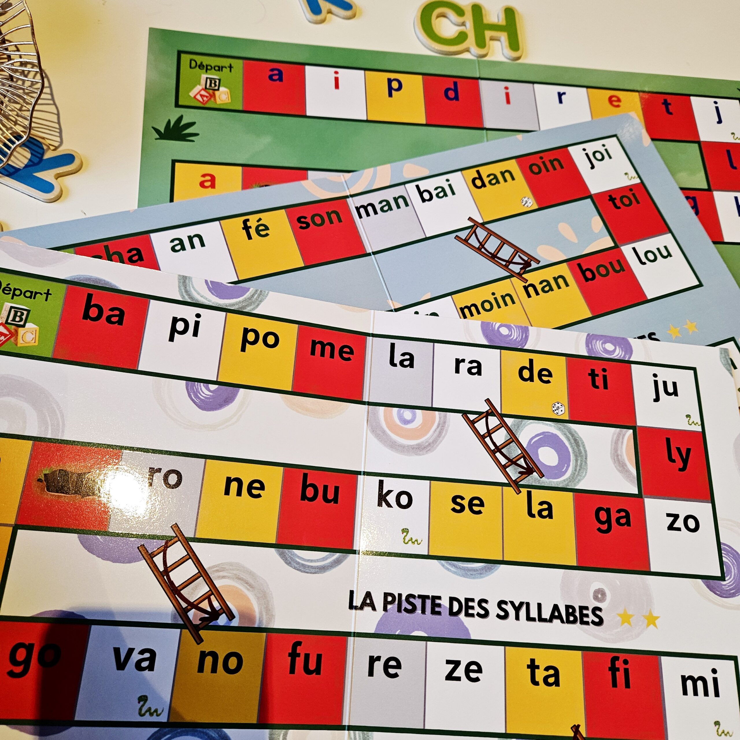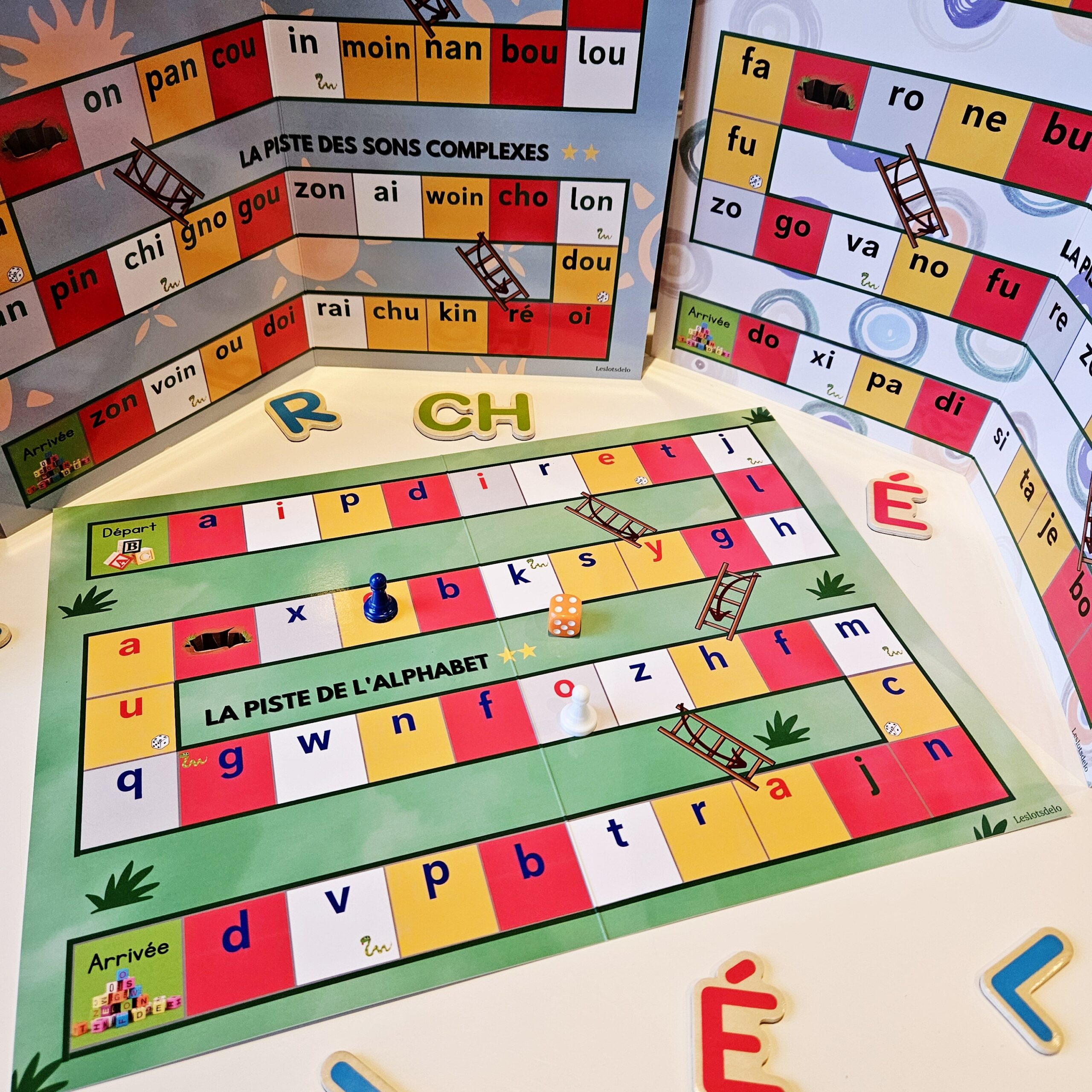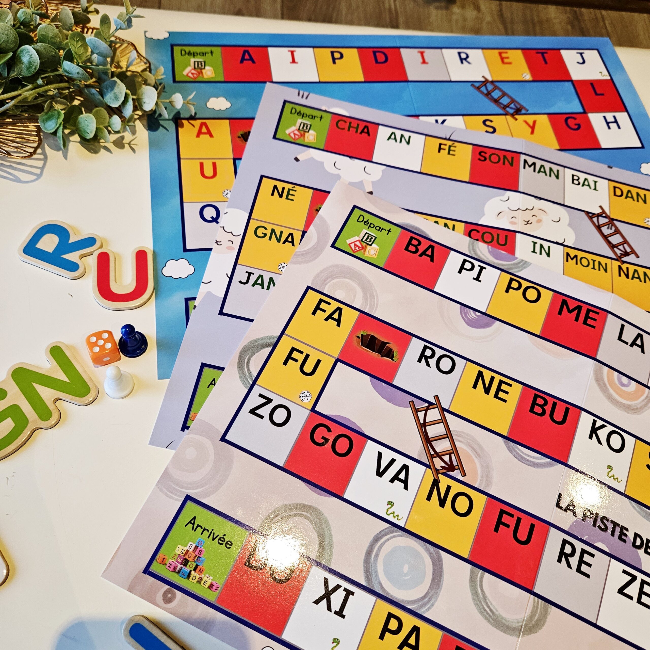 Des pistes format A3 inspirées du célèbre jeu de l’oie. Un support clair, coloré, facile à utiliser à la maison pour jouer avec la lecture au quotidien.