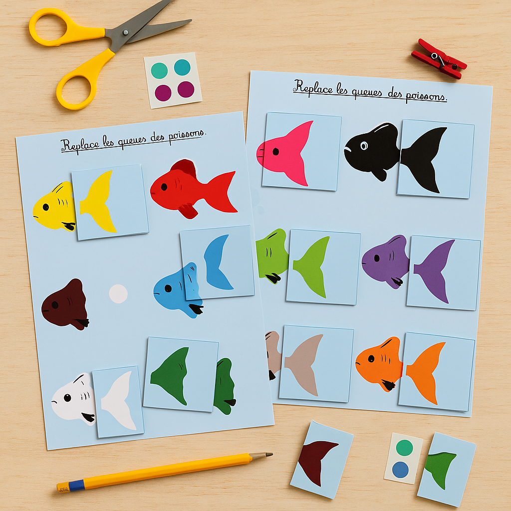 Associer les nœuds et les boîtes (ou les têtes et les queues de poissons) selon la couleur.