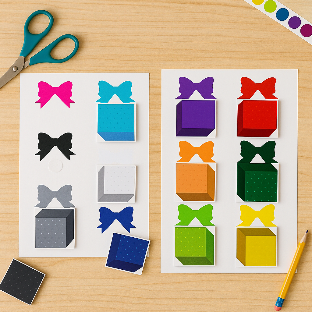 Quatre planches pour apprendre à reconnaître, nommer et associer les couleurs en s’amusant.