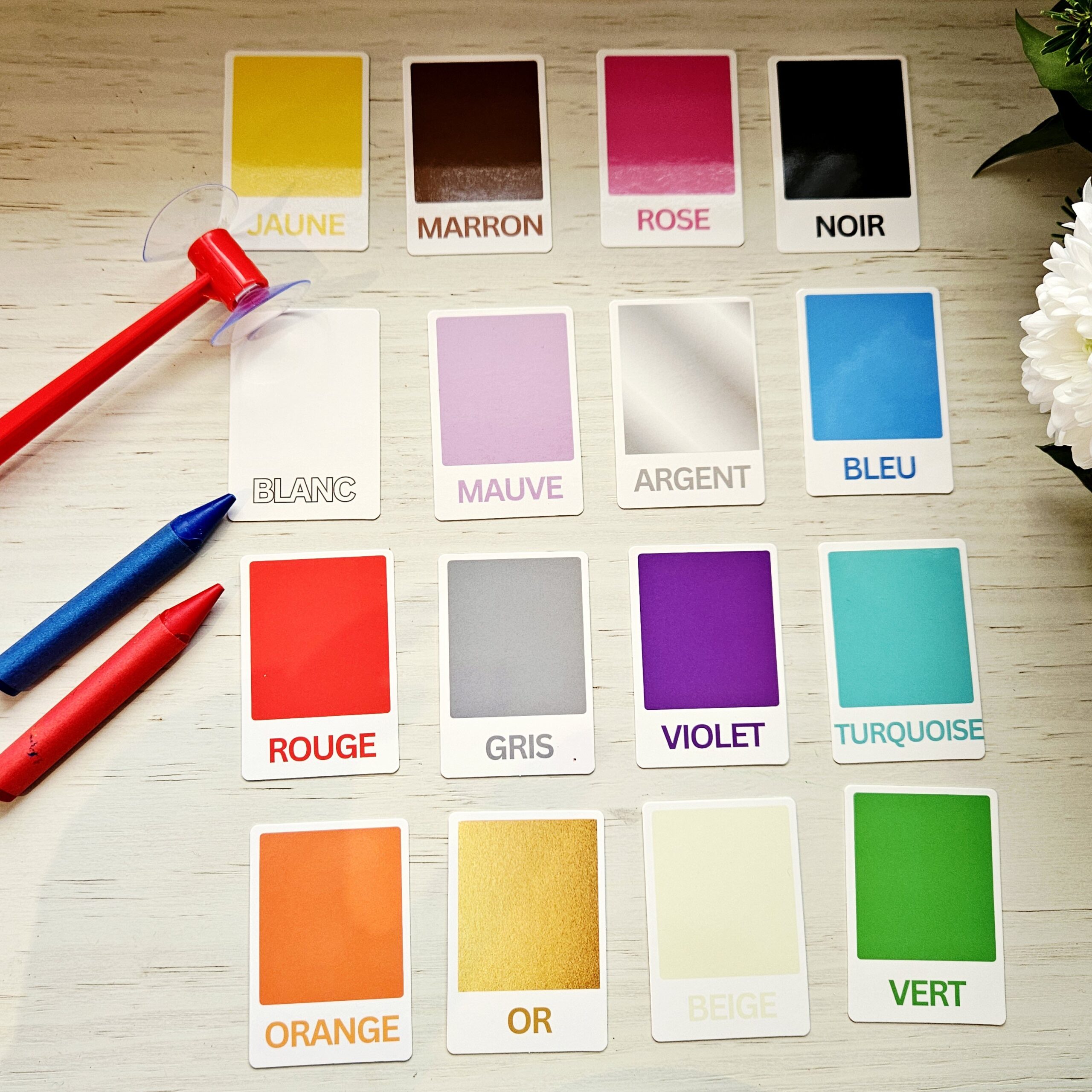Vous pourrez proposer des jeux autour des couleurs tels que nommer la couleur, désigner la bonne carte après avoir demandé “Où se trouve la couleur bleue”