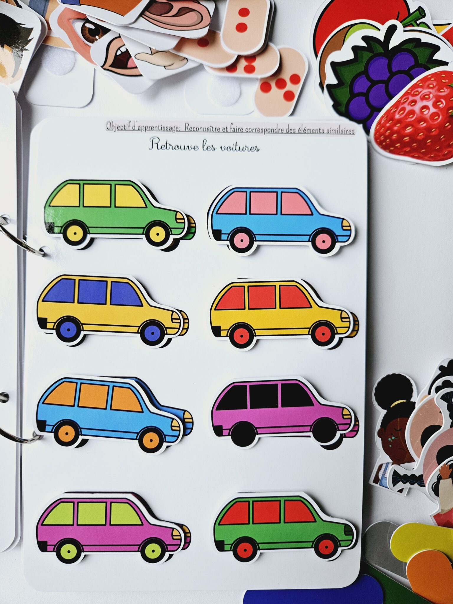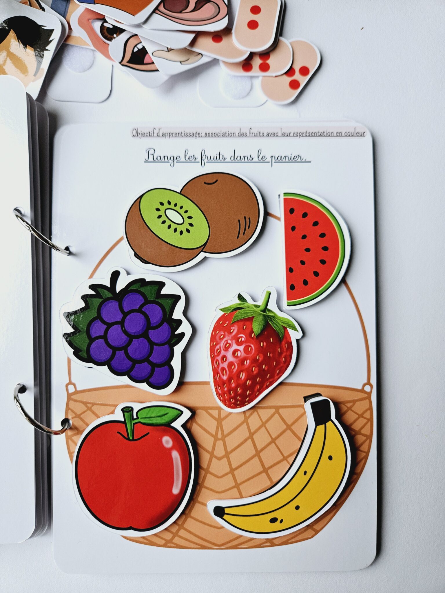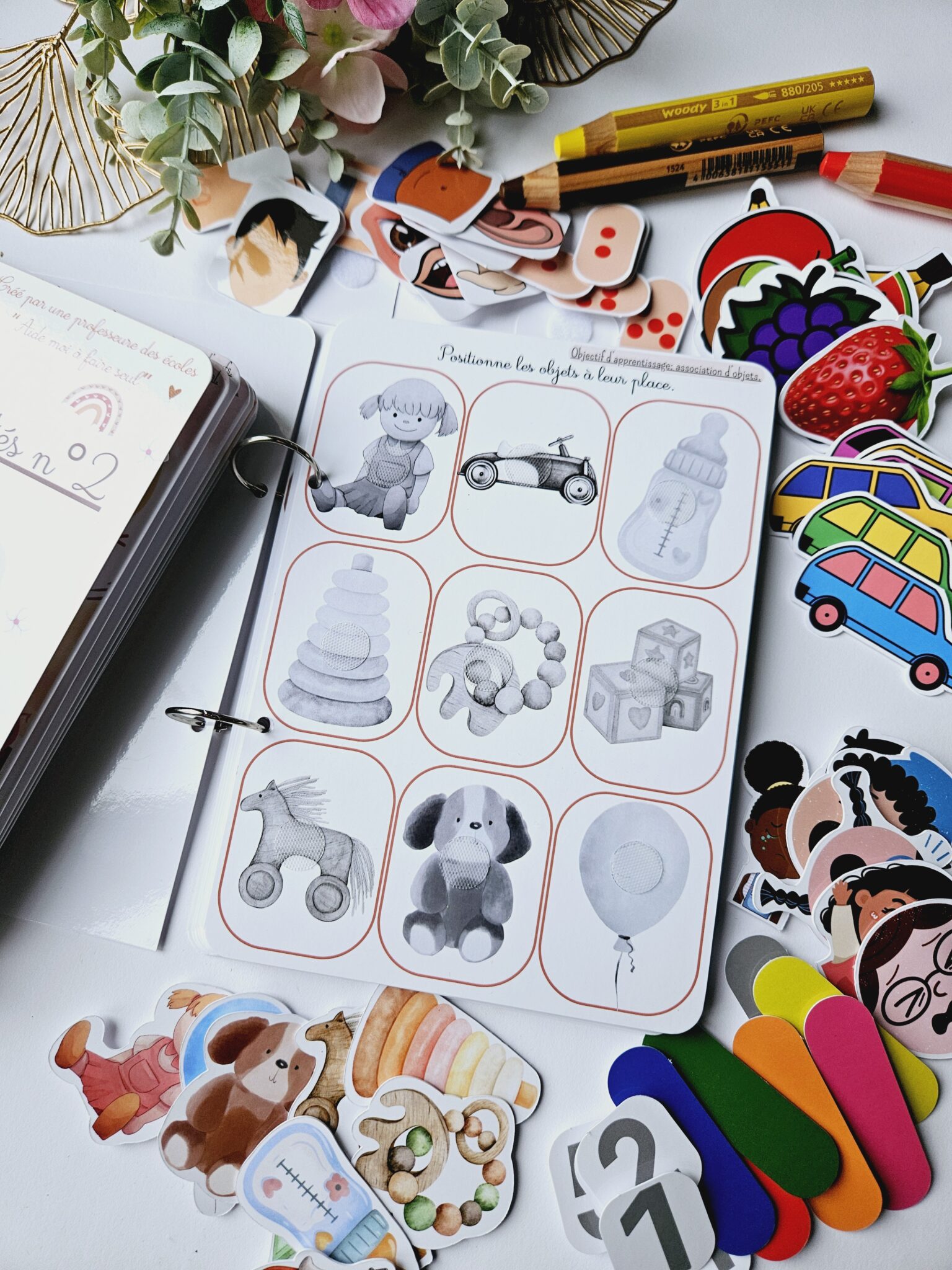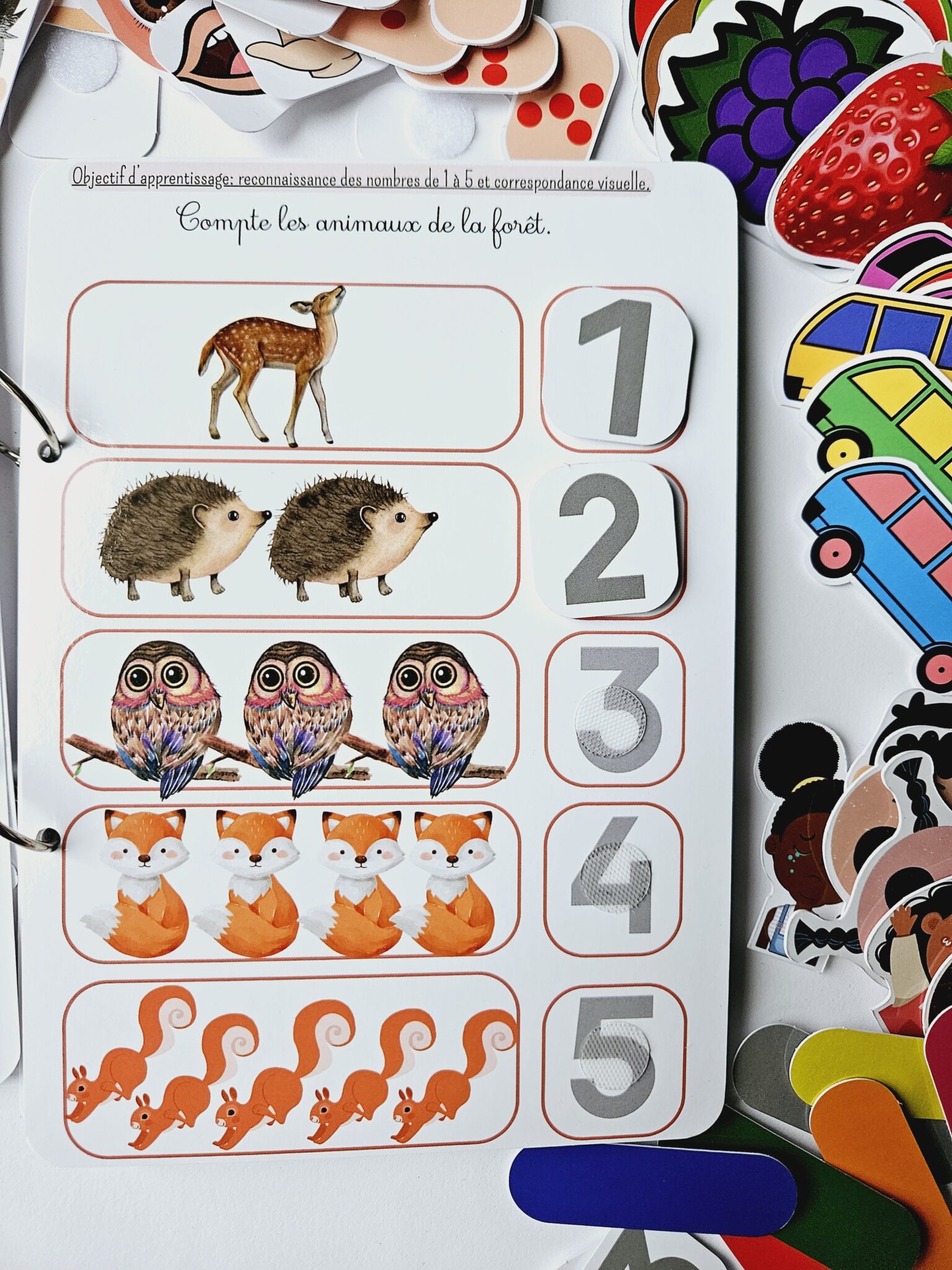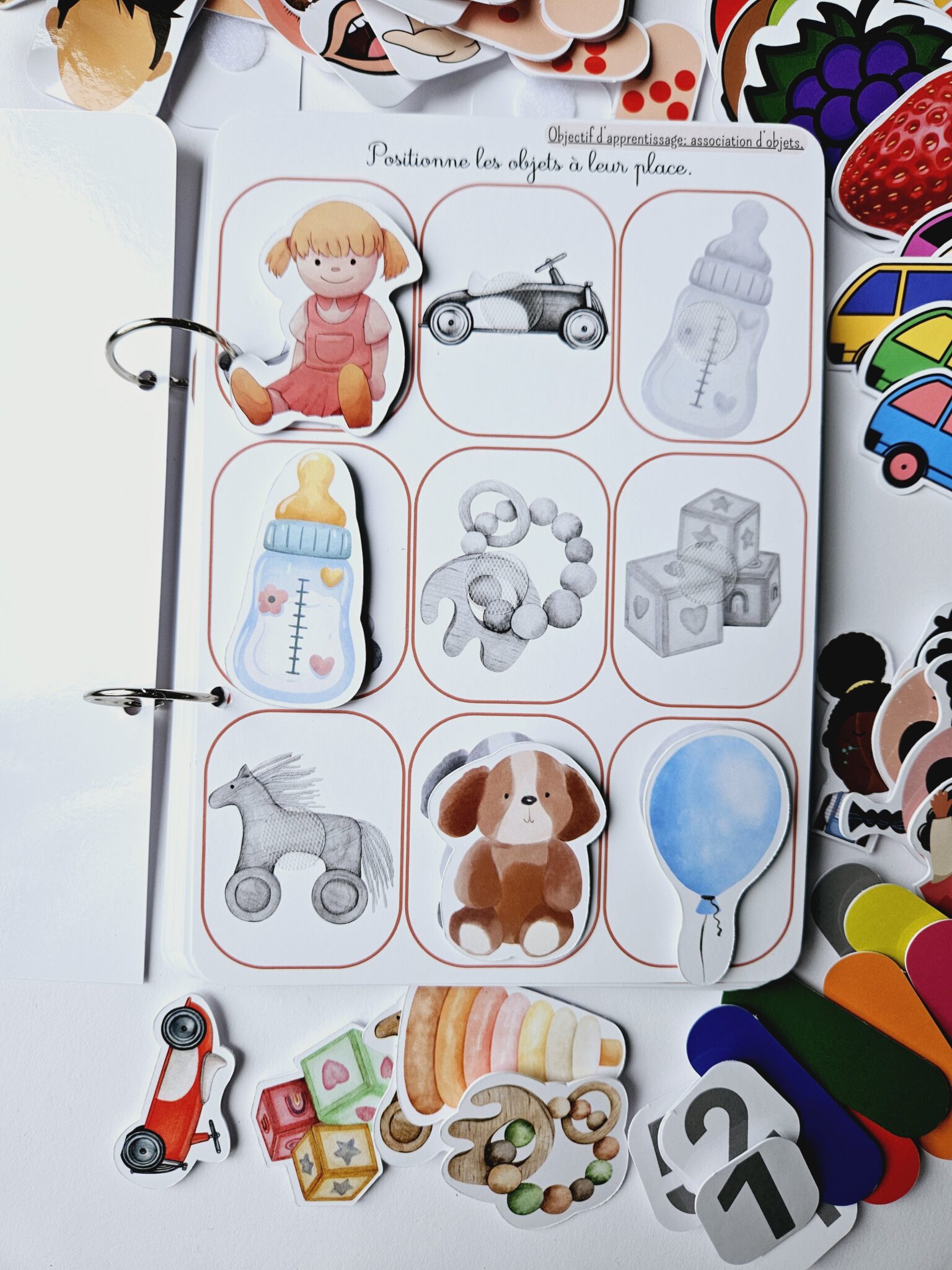 • ✂️ Livret en kit : Livret cartonné avec les 55 pièces à découper (celles-ci seront plastifiées) et à scratcher (velcros compris).