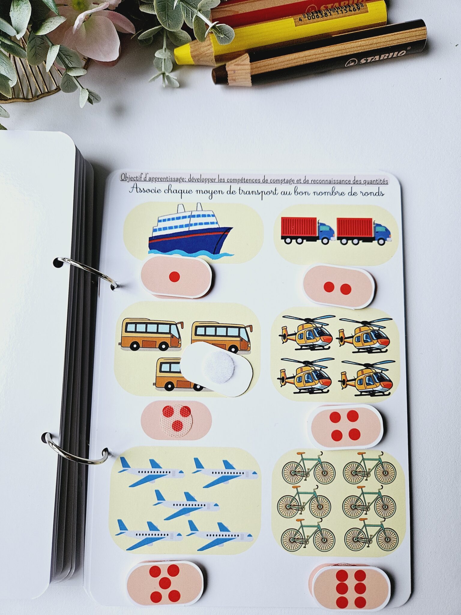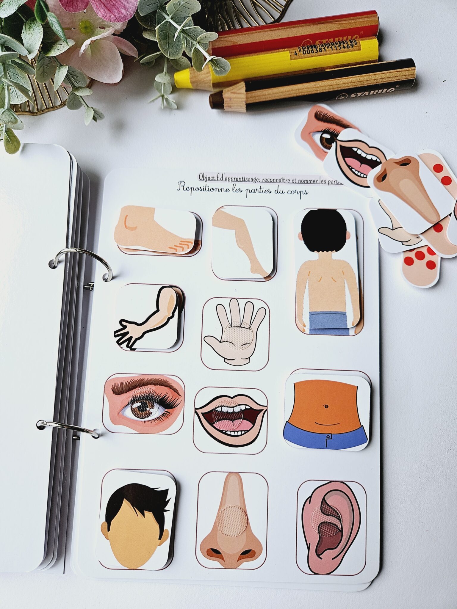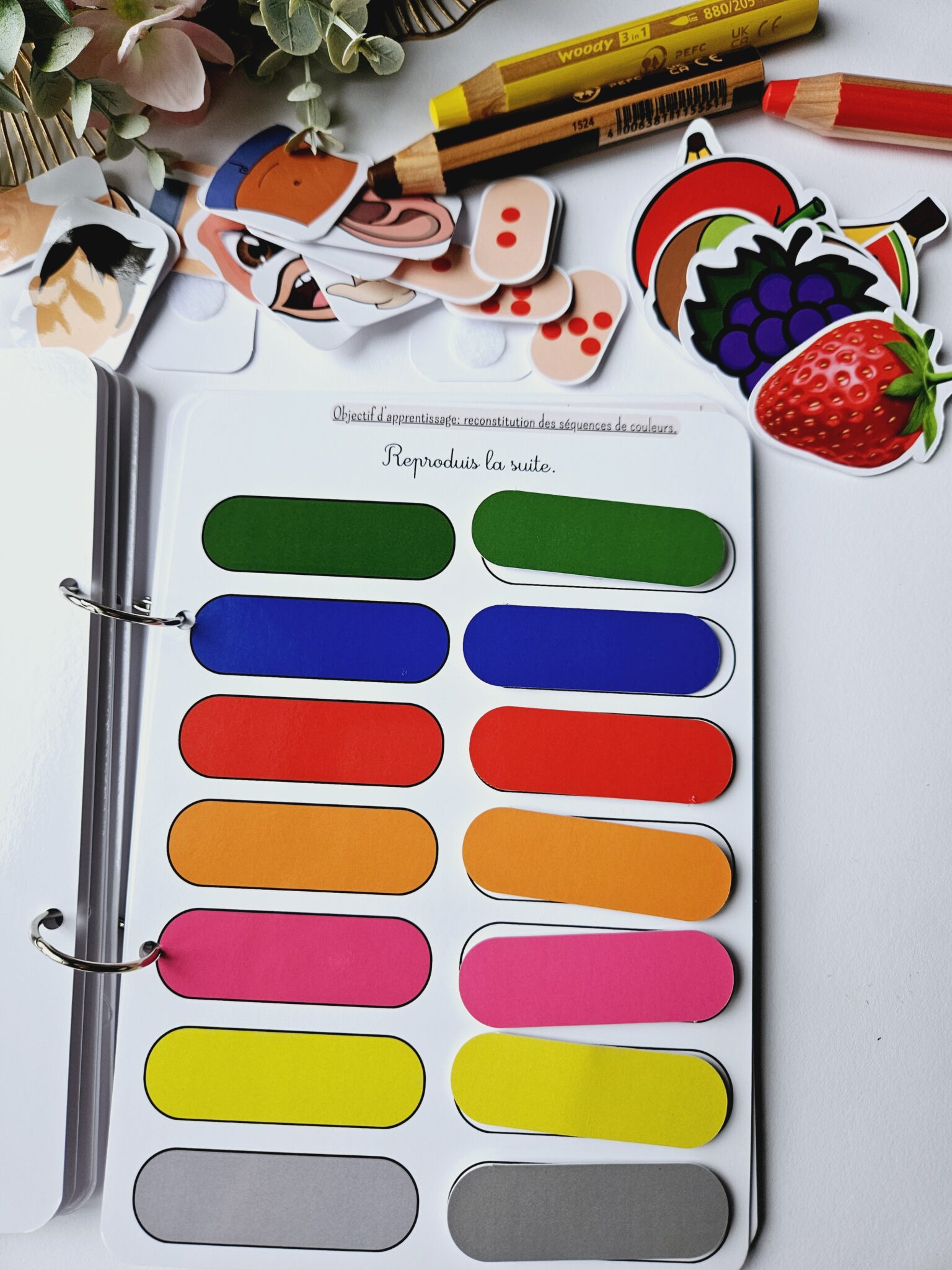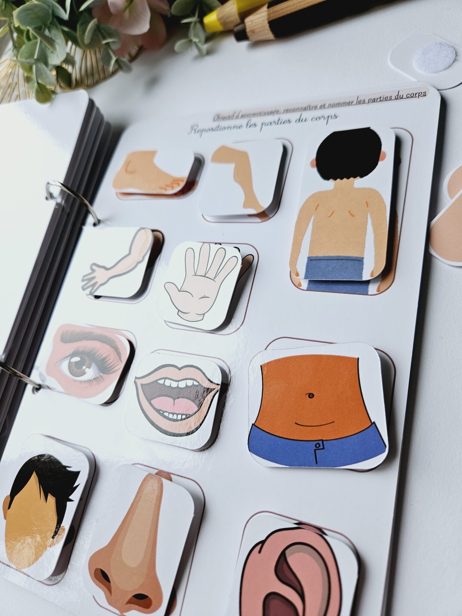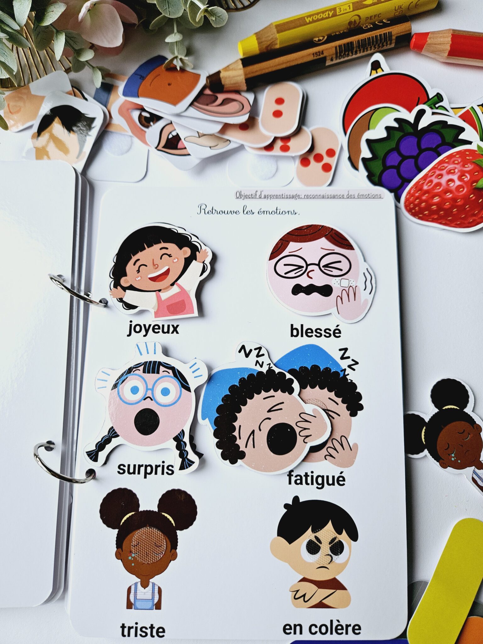 • ✂️ Livret en kit : Livret cartonné avec les 55 pièces à découper (celles-ci seront plastifiées) et à scratcher (velcros compris).