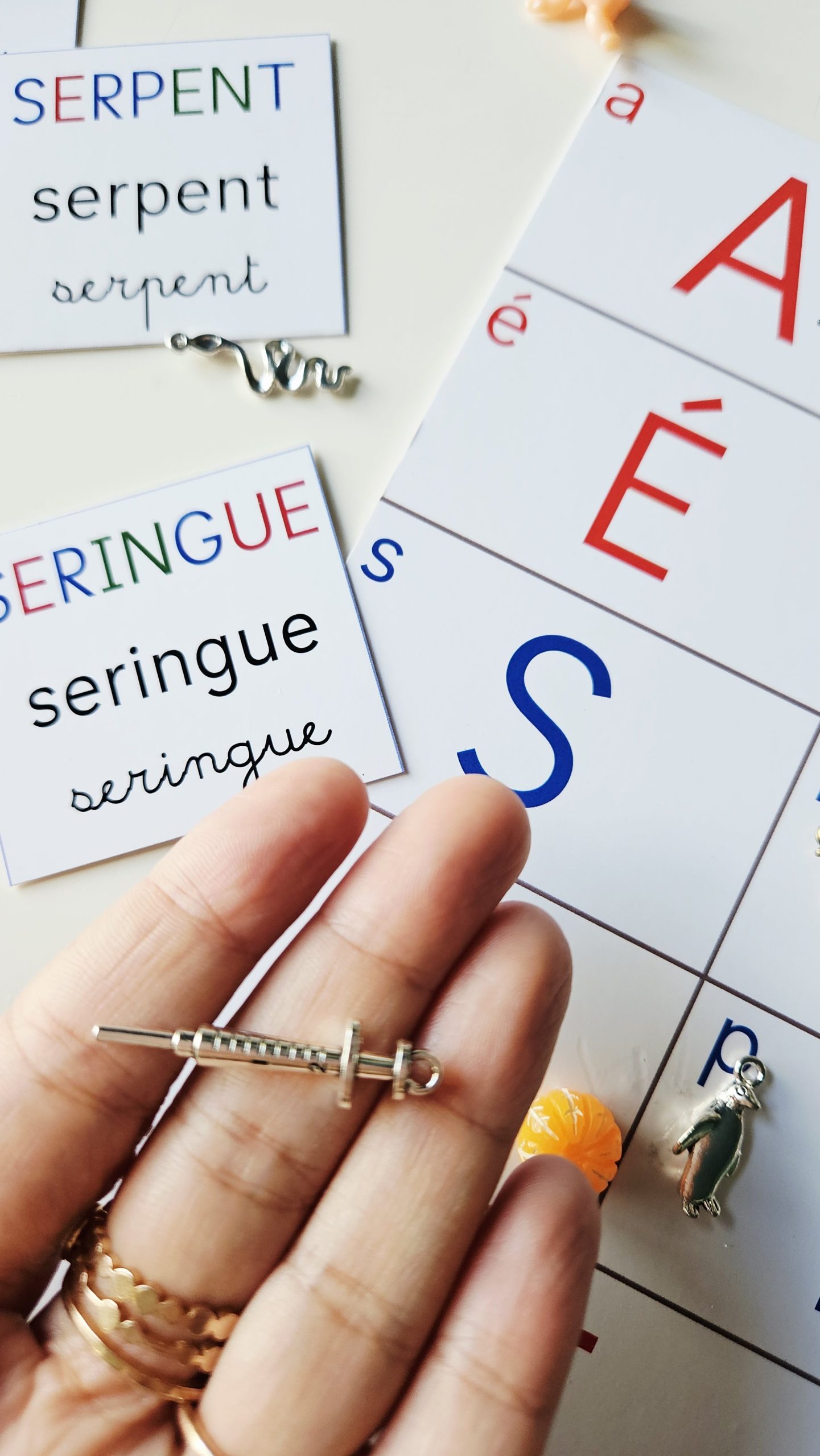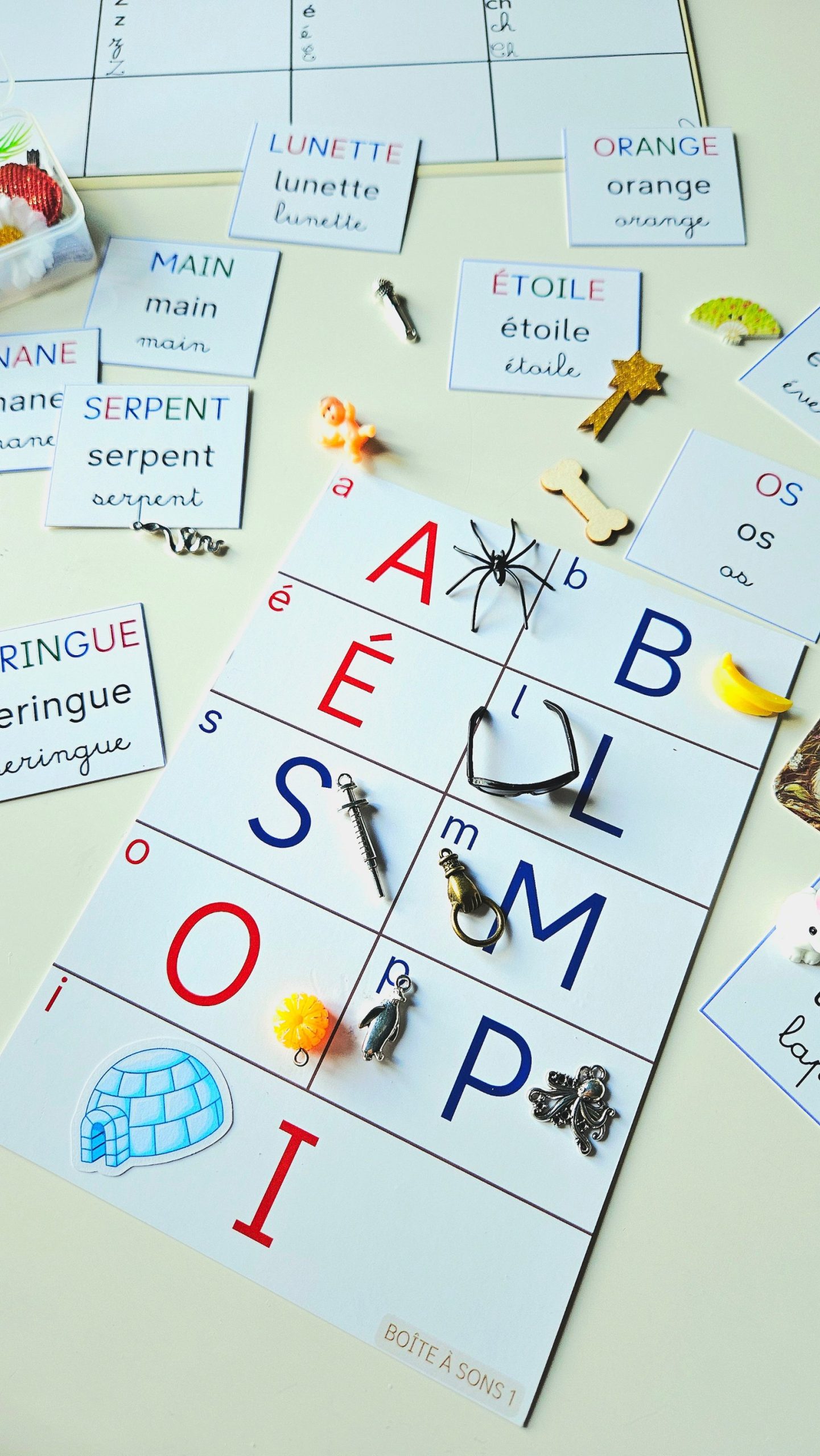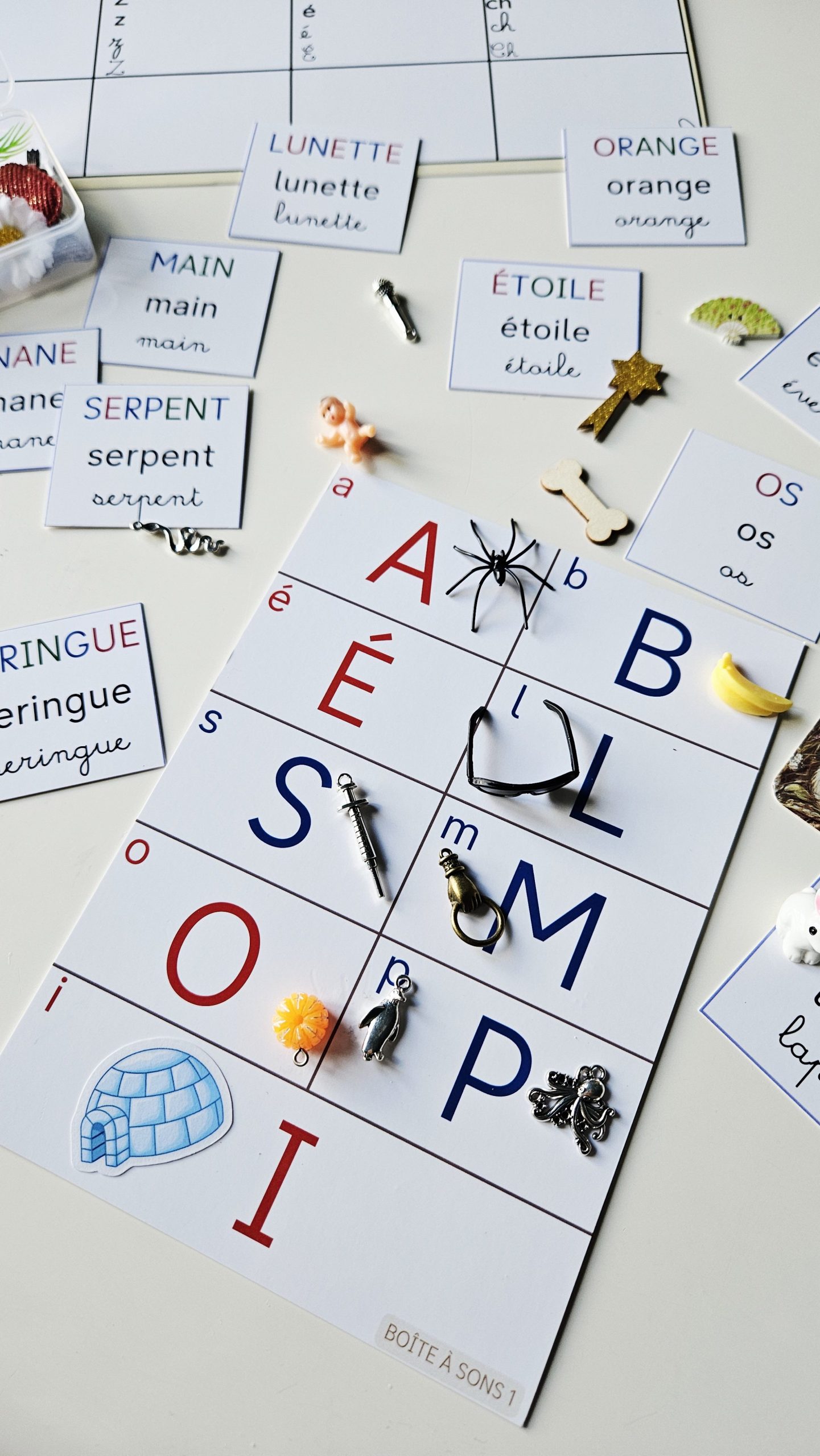 📦Boîte 1 : Sons simples – Pour débuter en phonologie – Contient les sons des lettres : A, B, É, I, L, N, O, P, S.