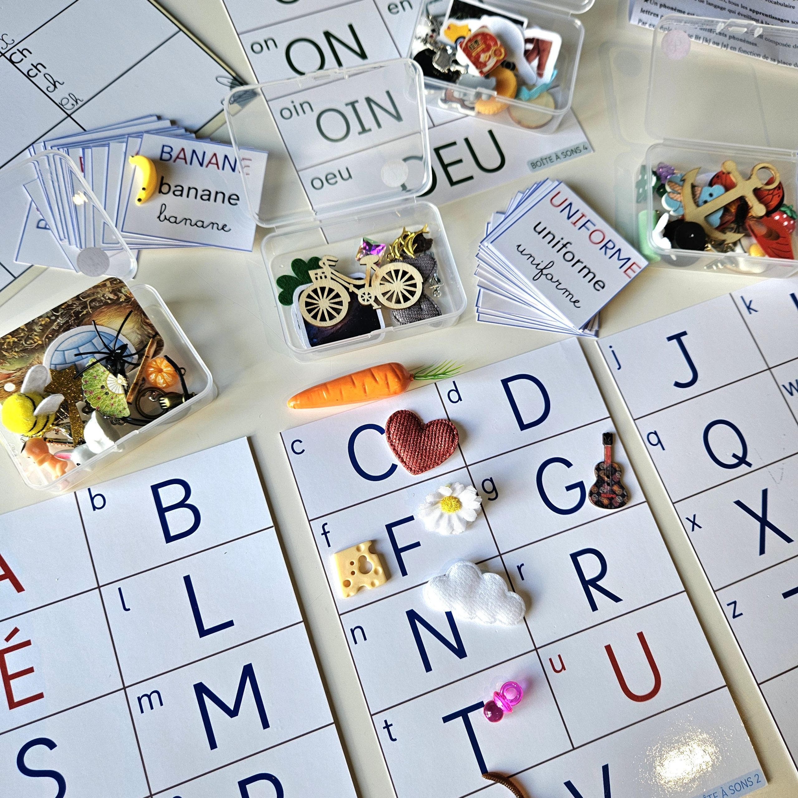 📦Boîte 4 : Digrammes – Pour apprendre les sons composés – Contient les sons complexes : CH, OU, OI, UN, ON, EN, OIN, AI, ŒU.