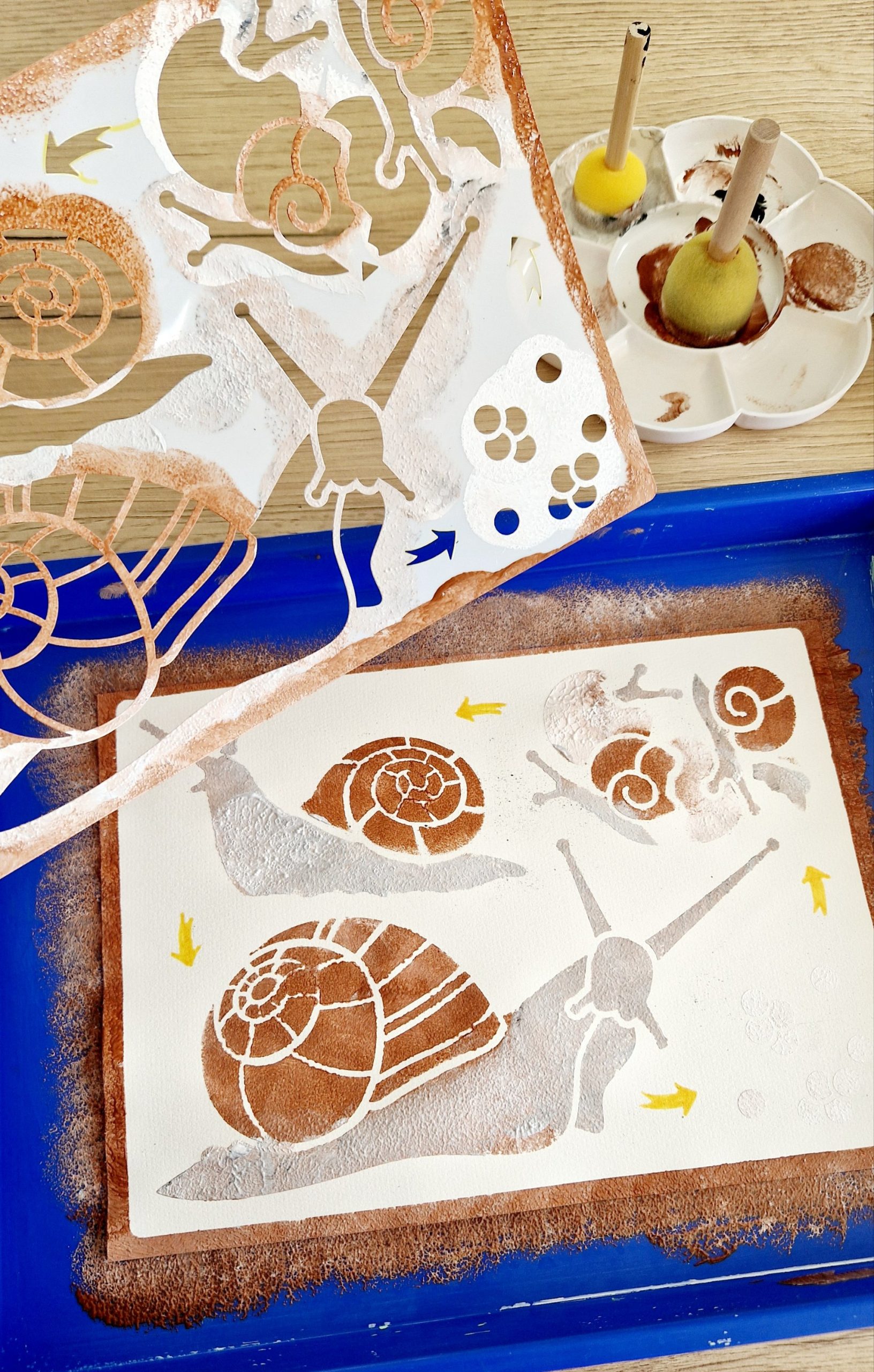 Dès 2 ans, le pochoir peut être utilisé avec une éponge trempée dans la peinture pour reproduire les formes.