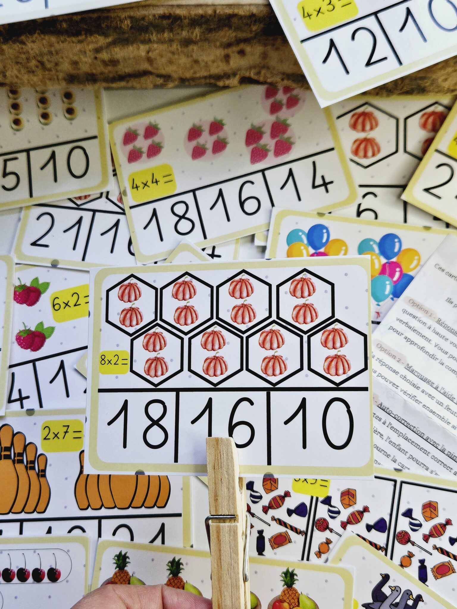 Chaque carte présente un petit problème de multiplication illustré, comme par exemple : 8 paniers de 5 fruits 🍎, pour représenter 8 x 5 .