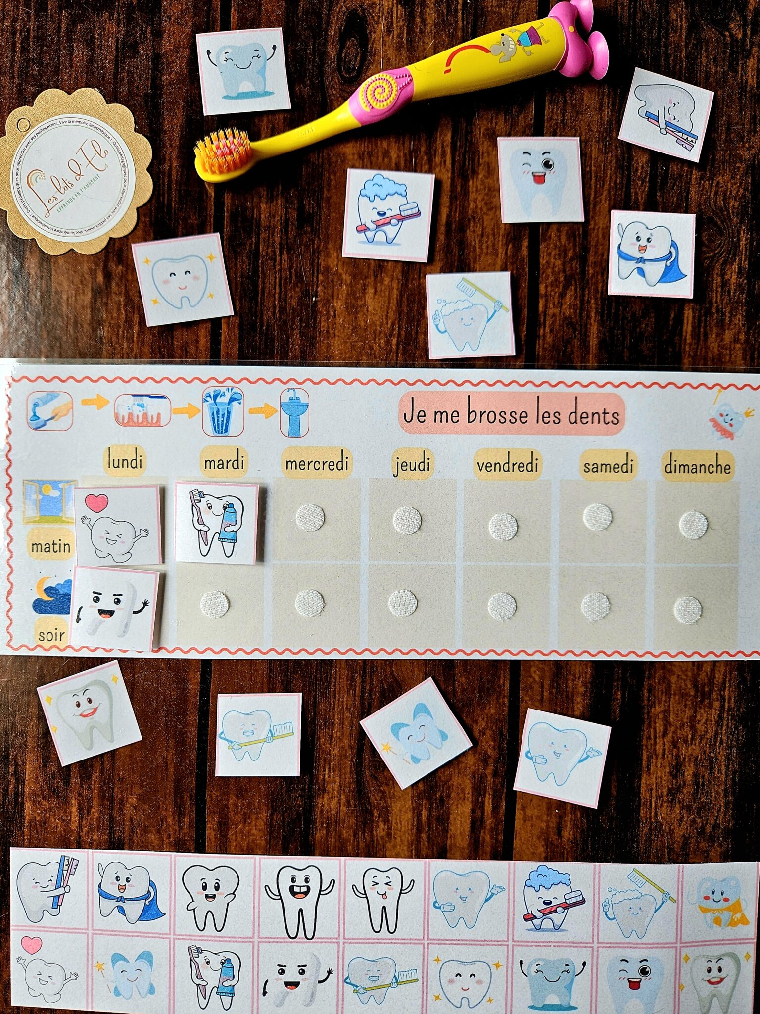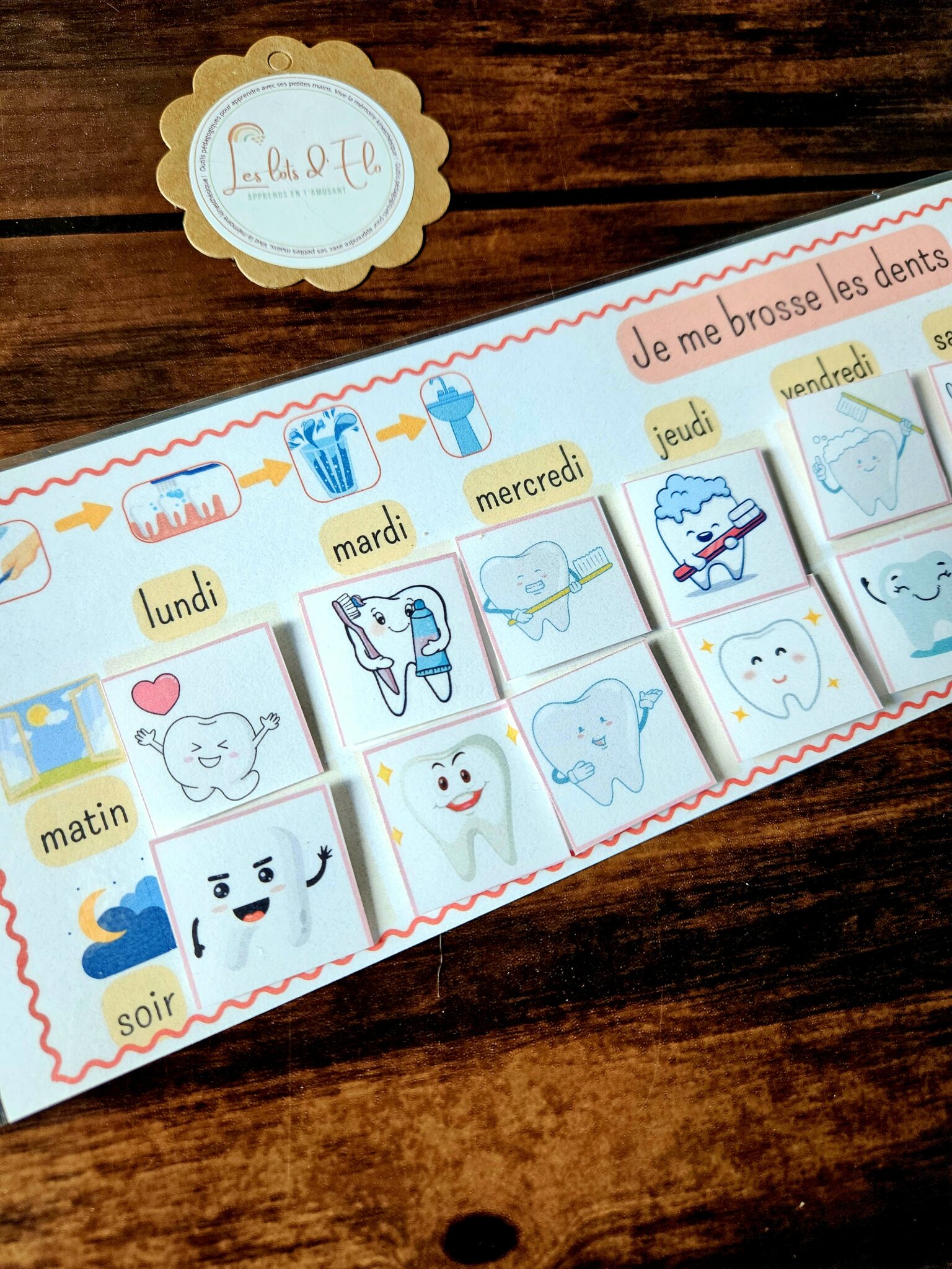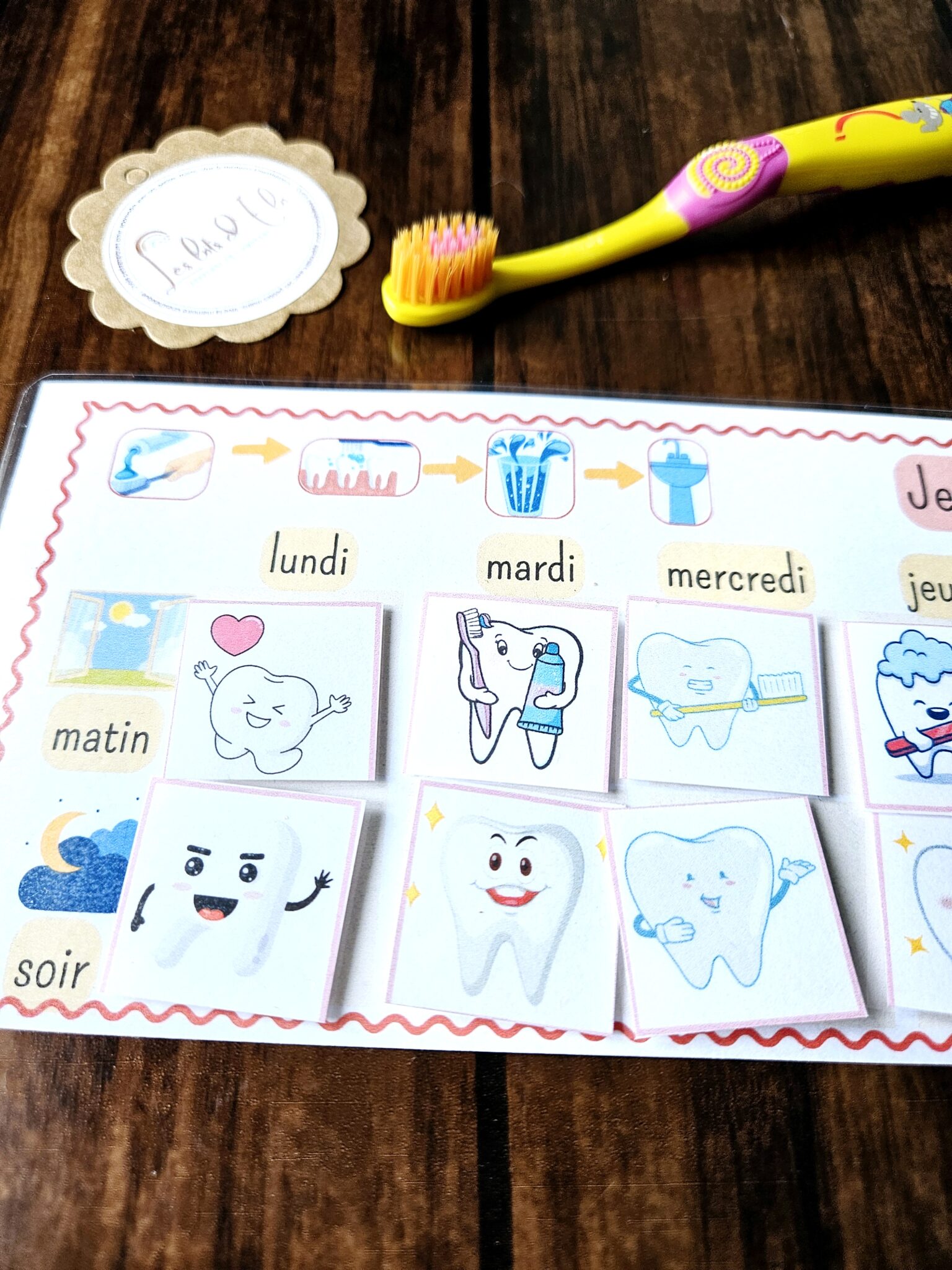 🦷 Suivi quotidien : matin et soir, l’enfant positionne une petite dent en velcro après chaque brossage.