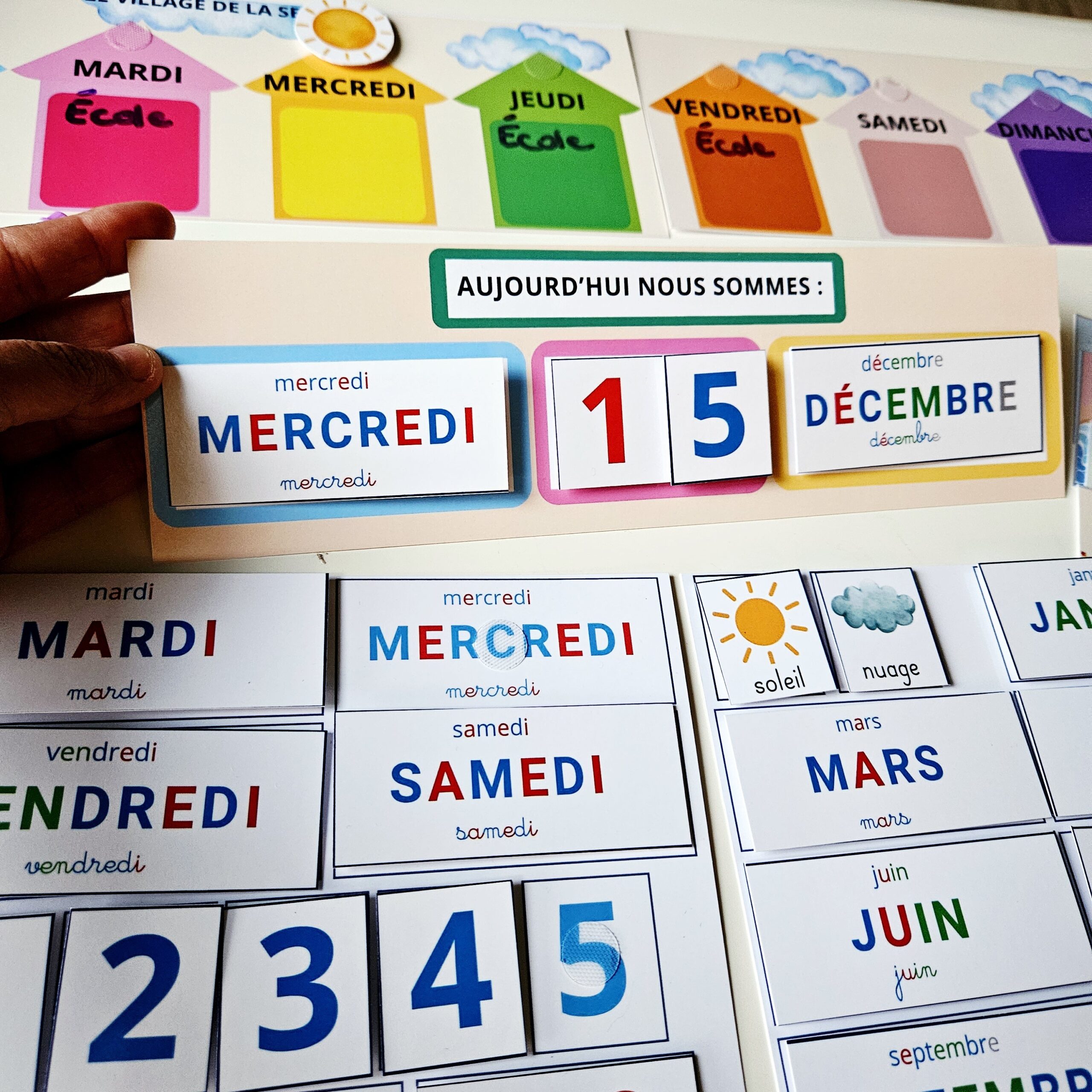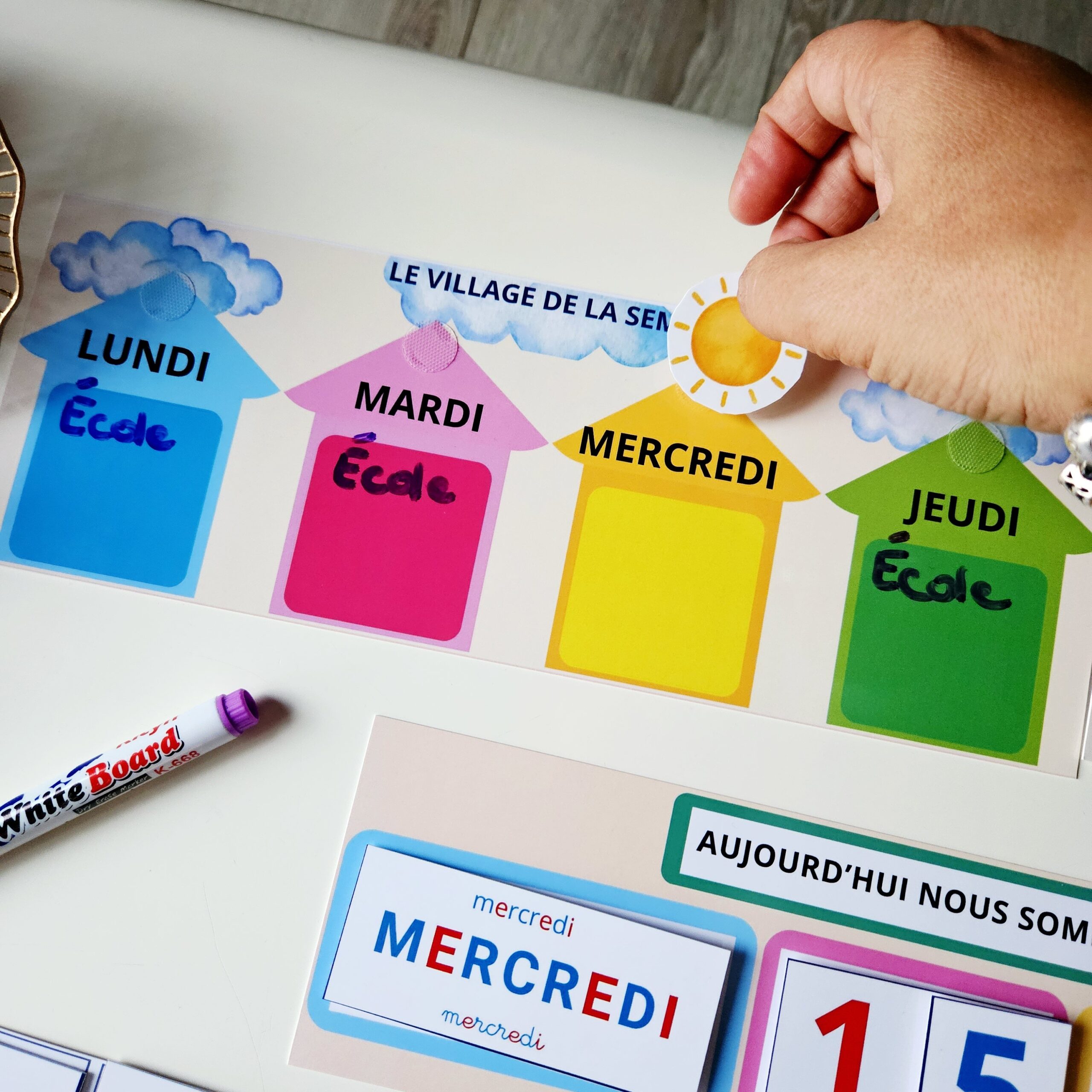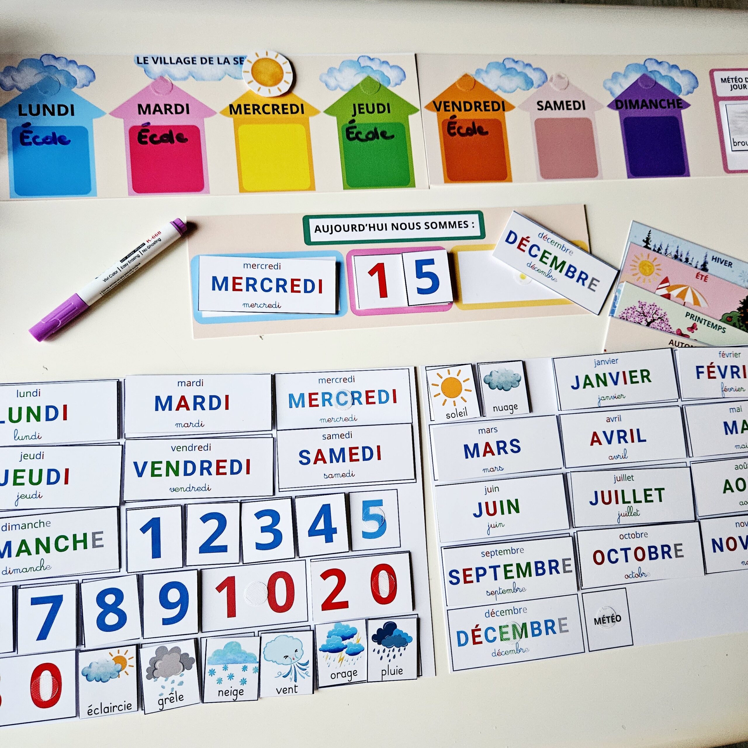 Un pack complet, coloré et ludique pour aider les enfants à comprendre les jours, les mois, les saisons et la météo. L’enfant place le jour dans le “village de la semaine”, écrit les événements importants, ajoute la date et la météo du jour. Un rituel simple pour structurer le temps… et commencer la journée sereinement !