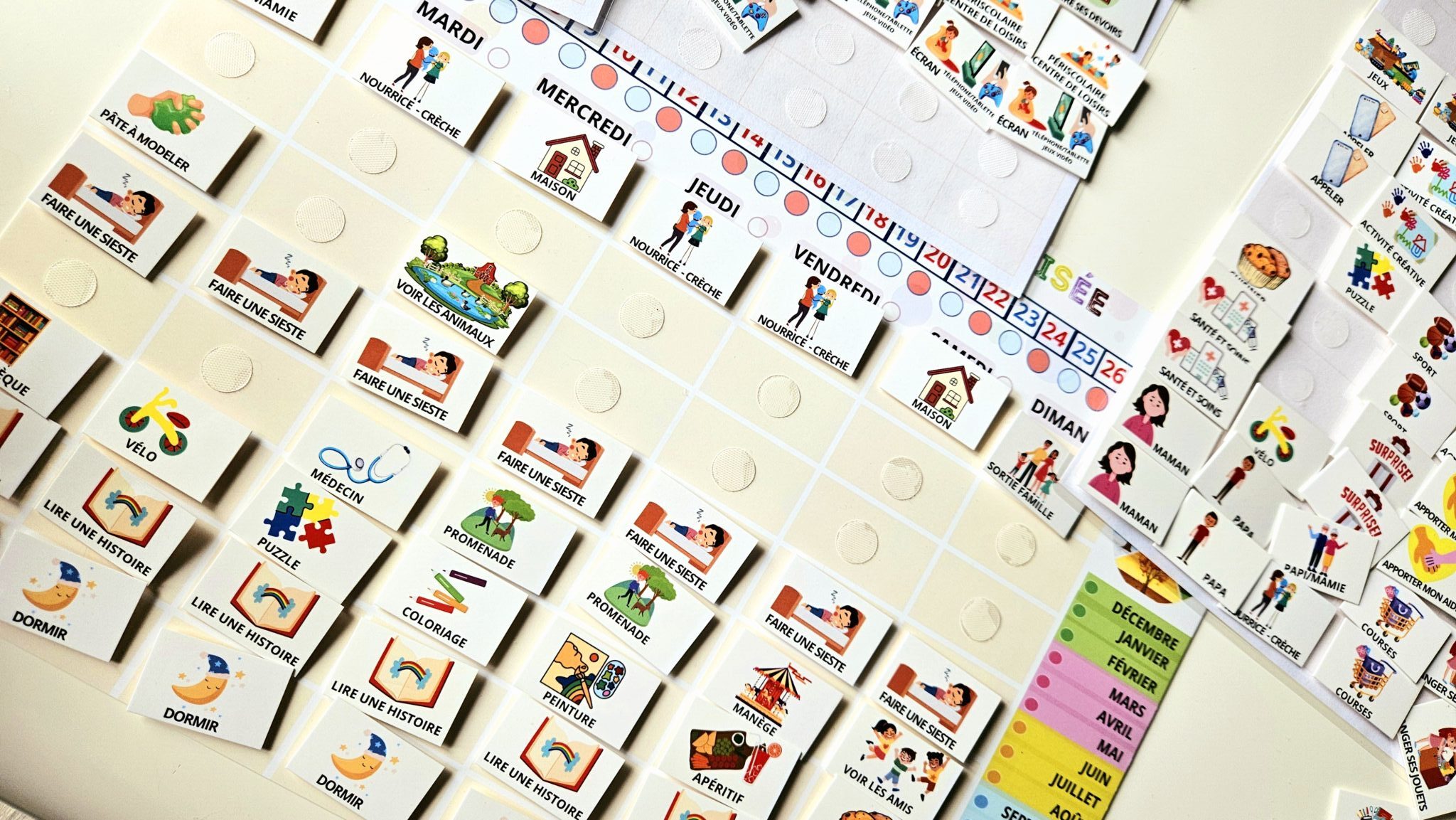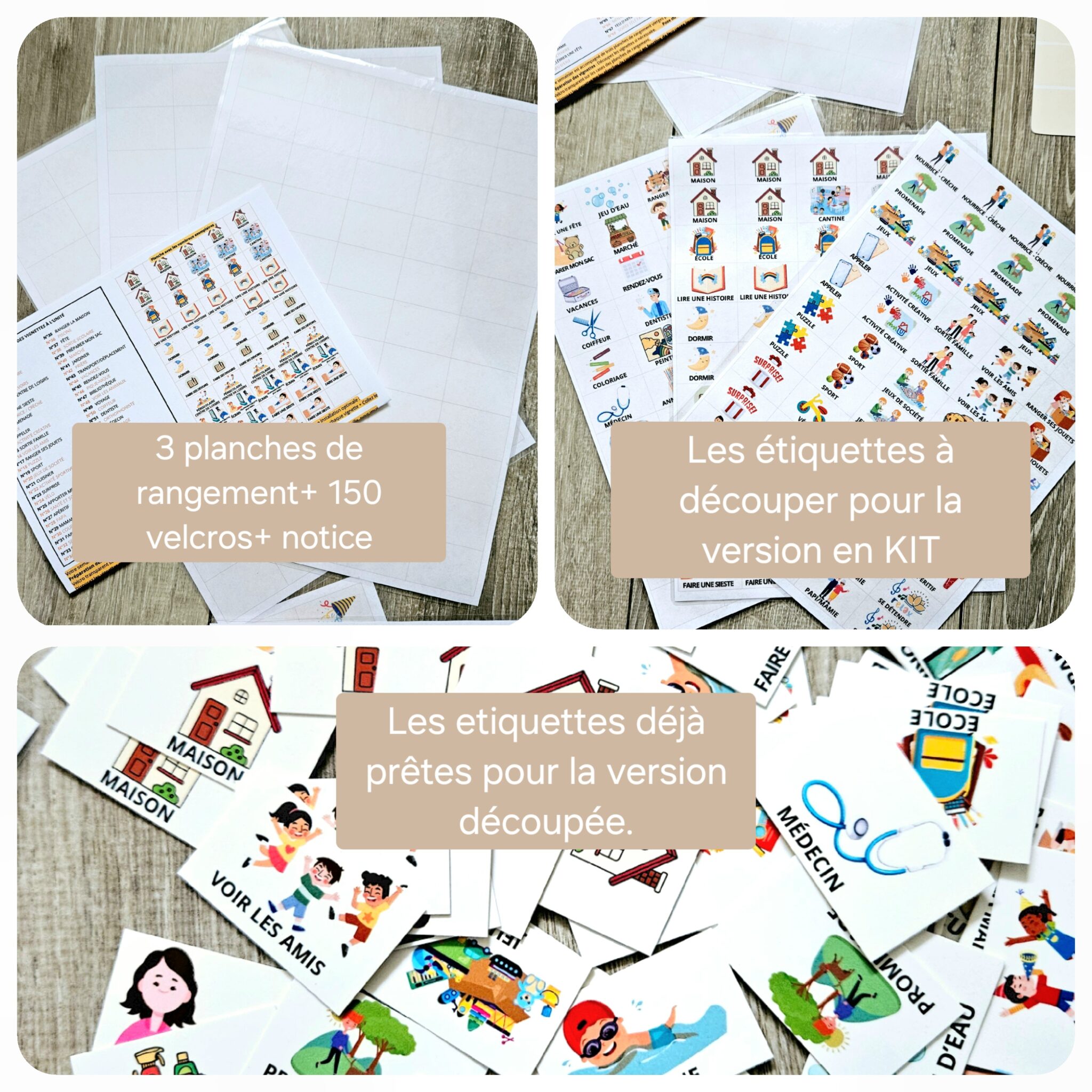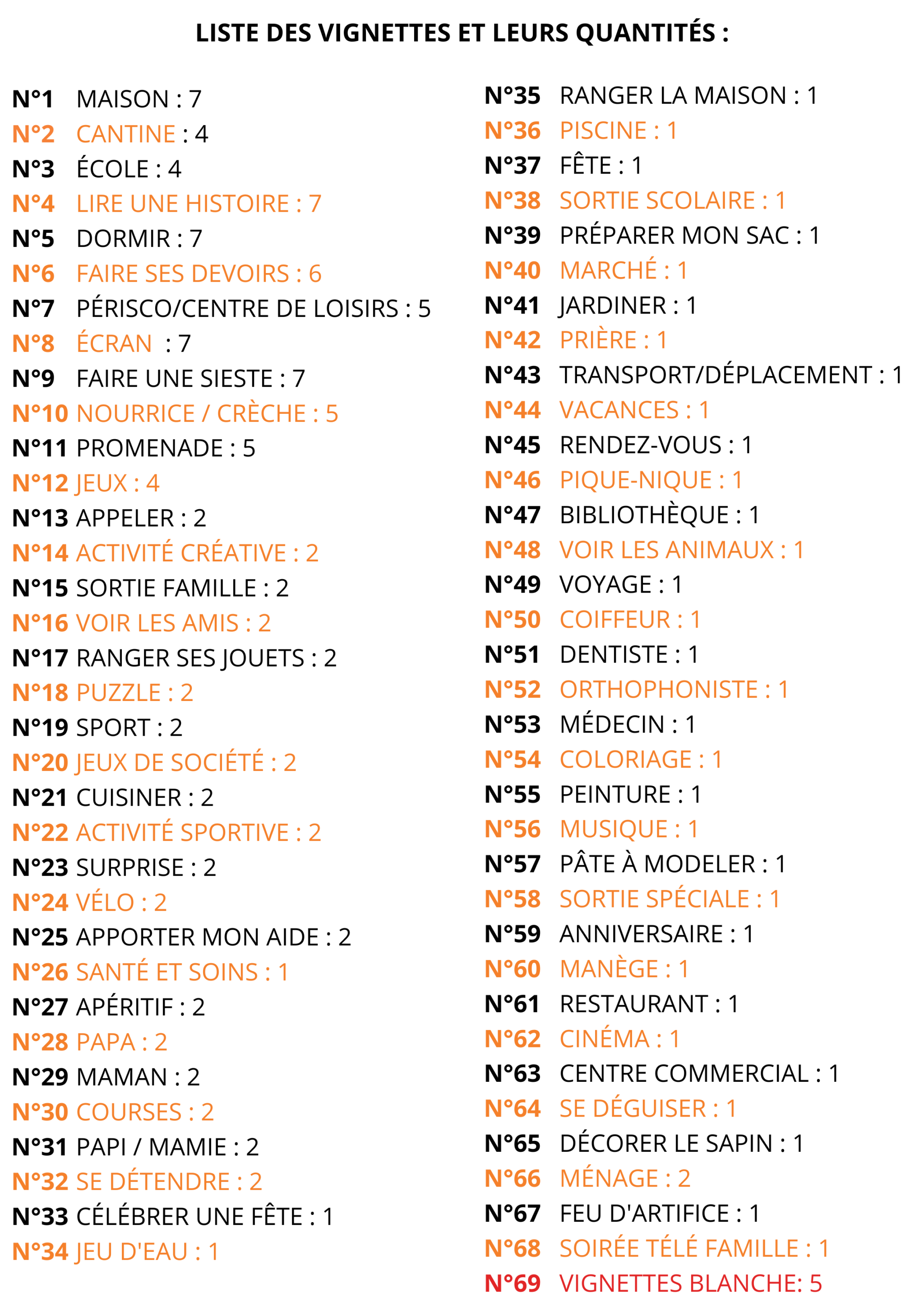 Les vignettes sont regroupées par grandes thématiques (ex. : “Activité sportive” plutôt que “foot”, “danse”…), pour moins de manipulations, une organisation plus claire et plus rapide au quotidien. Adapté à toutes les familles.